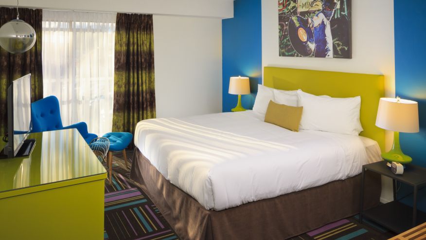 Ease into Valentine’s Day one day early at this offbeat, vintage-themed hotel, where a “nooner” is encouraged. You book a room between 11 a.m. and 2 p.m., choosing from among quirky themes like Bachelor Pad and King for a Night, each with neon walls and midcentury modern décor. If you venture outside, hop on a bicycle with your lover, thanks to free rentals.