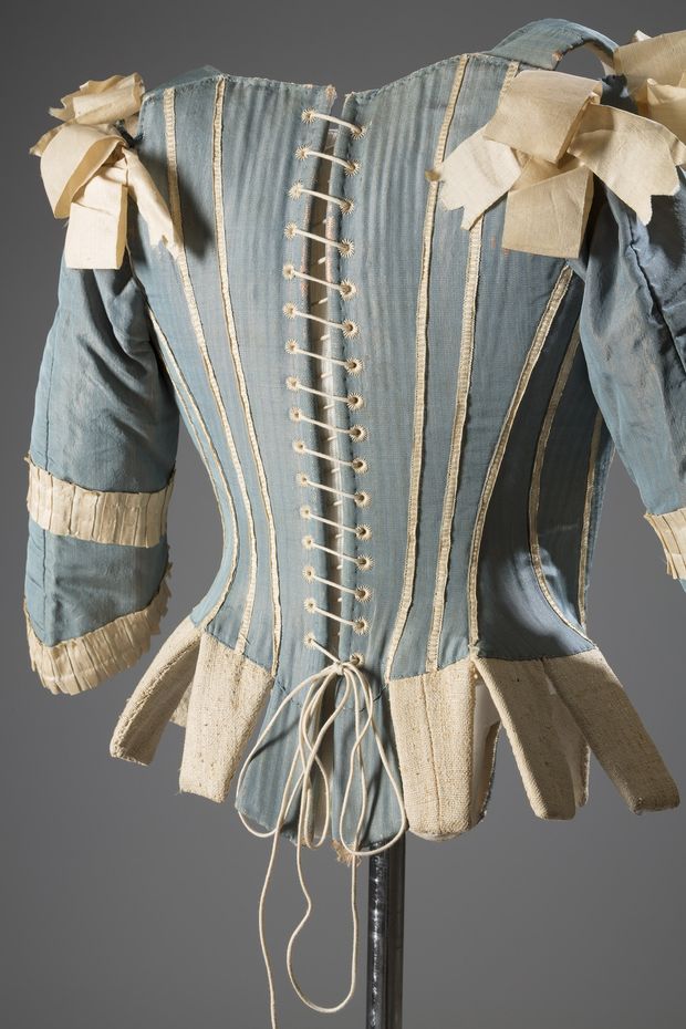 The earliest object on view is a sleeved corset from about 1770, made from blue silk with decorative ivory ribbons crisscrossing over the stomach. It also shows dressing gowns from the 1850s, which were made of cotton and meant to be worn in a woman’s bedroom.