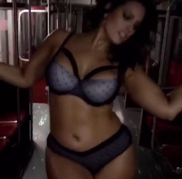 Sporting matching bottoms, the sexy model held onto the hand rail on the roof of the train as she sashayed and shimmied for the camera.