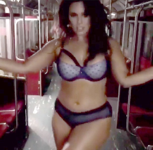Beauty beyond size: Strutting her stuff in a subway train, the brunette beauty put her ample cleavage on display in lilac and black balconette bra with black bondage strap detail
