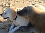 The best of friends! Seal and dog snuggle up on beach