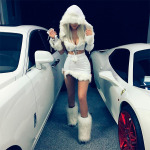 On the bottom she wore a pair of high-waisted black underwear, black lace stockings, garter belt and high black boots. All that does not make a dominatrix ensemble, though. She polished off her incredibly sexy look with a feathered riding crop, bow tie, fingerless gloves and tiny top hat. Perfection! And also way intimidating! Do you think Scott Eastwood‘s seen these pics yet?
