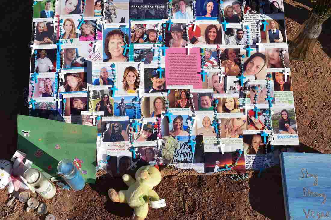 The 58 fatalities in October’s mass shooting in Las Vegas all died of gunshot wounds, the county coroner and medical examiner said Thursday. A makeshift memorial on the south end of the Las Vegas Strip a few days after the shooting has photos of some of those who were killed.