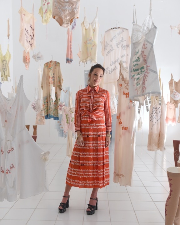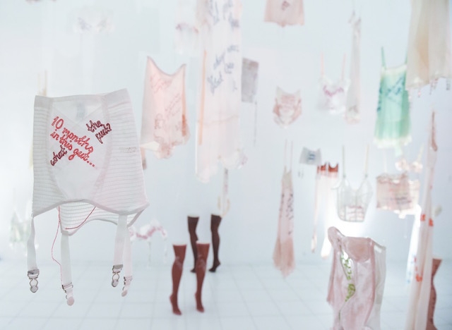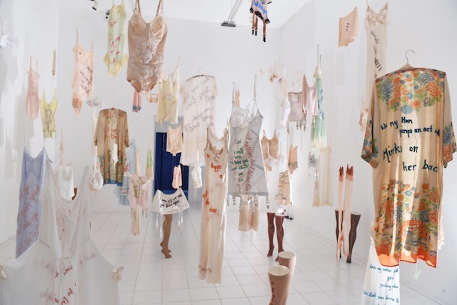 An installation comprised of vintage lingerie, hand-embroidered with lyrics from celebrated rappers, tackles the position of subordination women have long held in hip-hop culture. In an ingenious fashion, artist Zoe Buckman‘s exhibition, Every Curve, juxtaposes the genre’s often crude attitudes towards women with utterly feminine articles of dress, resulting in thought-provoking objects.