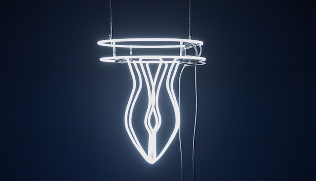 The exhibition also continues Buckman’s interests in chastity belts. A neon sculpture in the form of a chastity belt hangs, an antiquated symbol long associated with the torment of women. An installation of several hanging chastity belts fashioned from smooth metal and powder, coated into an array of luscious pastel tones, draws inspiration from 50s diners and kitchen interiors. But on closer inspection, what seems to be eye candy becomes something slightly ominous: the belts have jagged vaginal openings, and no longer seem playful, but rather dangerous.