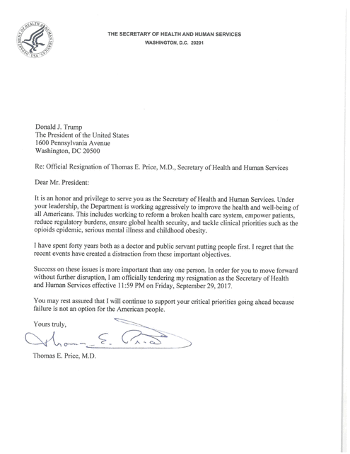 Read the Resignation Letter Tom Price Sent to President Trump