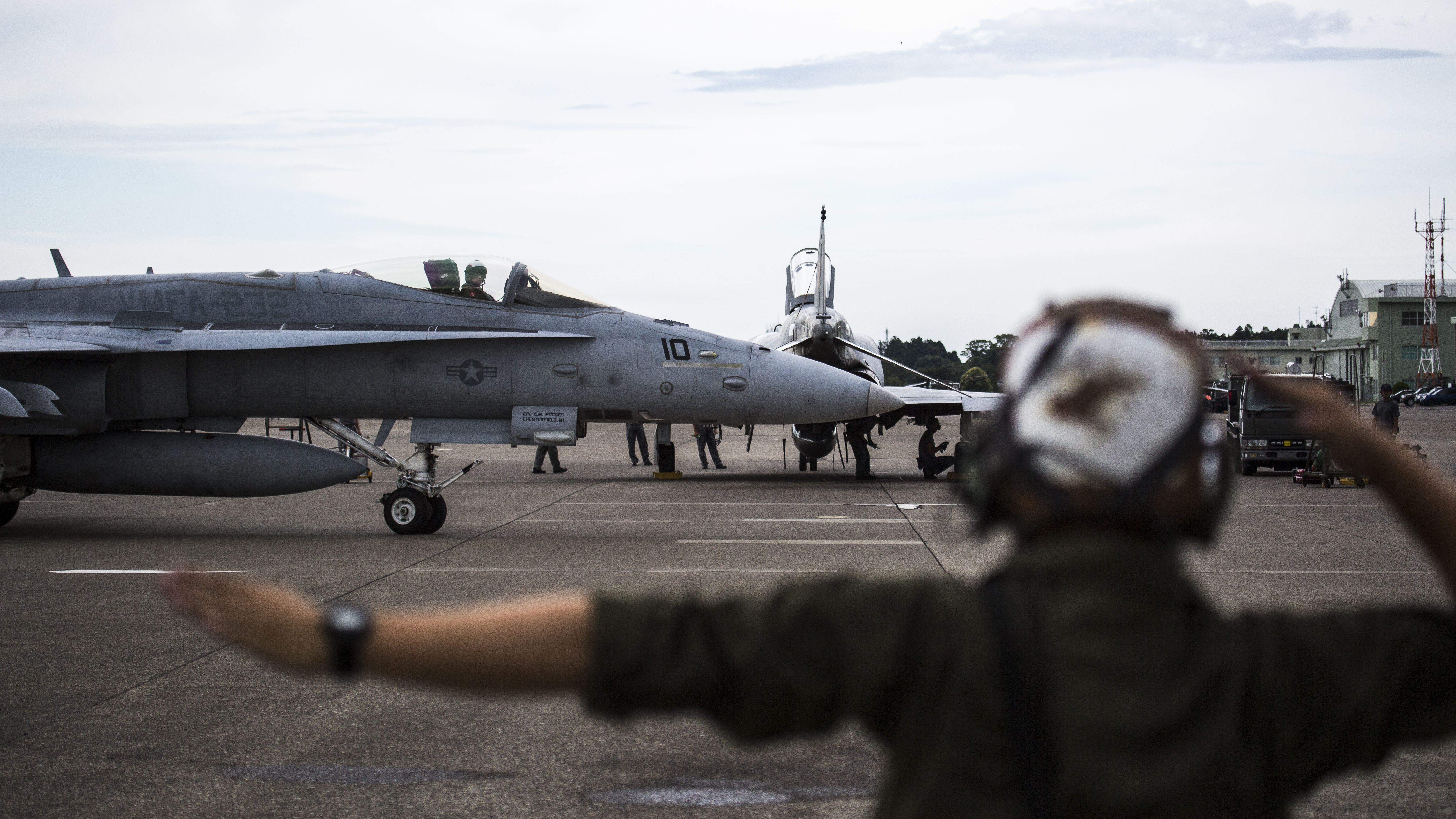 U.S. Marine Corps Lance Cpl. Jesse Schmitt, a powerline mechanic with Marine Fighter Attack Squadron (VMFA) 232, gives directions to an F/A-18C Hornet at Japan Air Self-Defense Force (JASDF) Hyakuri Air Base, Japan, July 18, 2017. US Marine Corps photo.