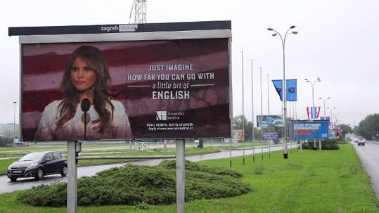 A billboard showing first lady Melania Trump next to the phrase “just imagine how far you can go with a little bit of English” was removed Tuesday in Croatia after Trump’s Slovenian lawyer threatened a lawsuit.