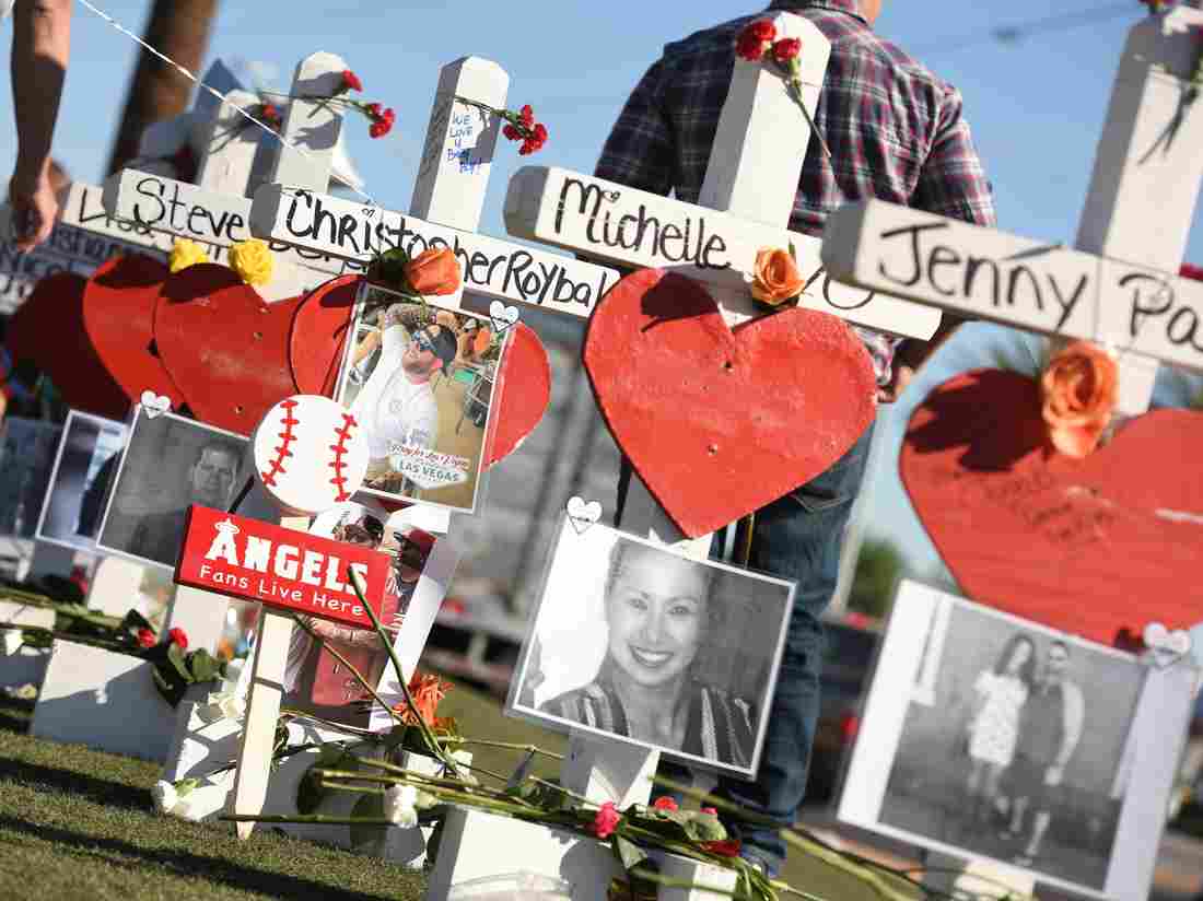 Some of the 58 white crosses for the victims of Sunday night’s mass shooting last Sunday, on the Las Vegas Strip south of the Mandalay Bay hotel on Friday. “Their names and their stories will forever be etched into the hearts of the American people,” Vice President Pence said while visiting the city on Saturday.
