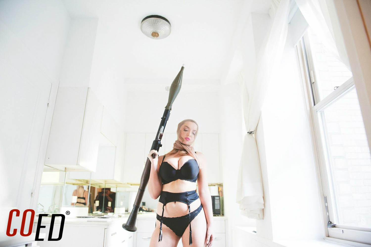 The concept behind our second shoot was that Lauren and big guns are both things that men love, so why not throw her into some sexy black lingerie and hand her one of the biggest firearms known to man? The results were pretty… explosive.