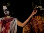 Dramatic: The stunner goes along with the weird obsession as he shows her his bizarre collections of disguises before he plucks out a green one and places it over his handsome features