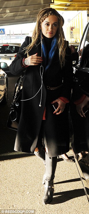 Keeping covered up: Ora held her coat shut as she strutted through the airport