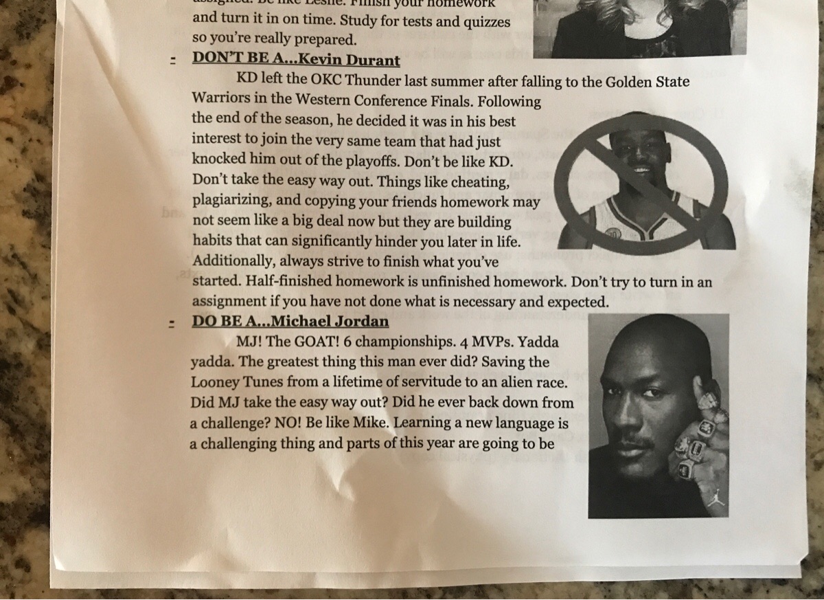 Teacher used handout to tell students to be like Michael Jordan, not Kevin Durant