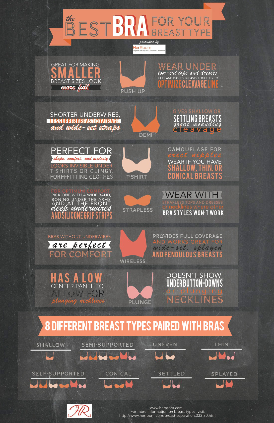 Just as the right clothes help you look and feel your best, the right bra could be the missing puzzle piece to perfecting your outfit. That’s why when online lingerie outlet HerRoom released the infographic below—the best bras for your breast type (!)—we were hooked.