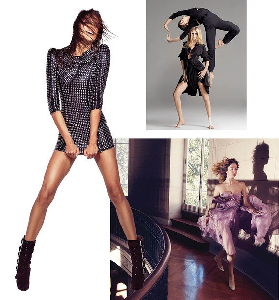 BODY POSTURE | Clockwise from left: Daria Werbowy in French Vogue, 2009; an acrobatic 2009 Jean Paul Gaultier ad featuring Lara Stone; Raquel Zimmermann strides along a balcony for Nina Ricci, 2012.