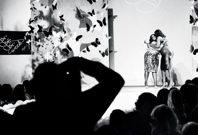 Full Figured Fashion Week is as much a fashion show for the audience as for the models. “People have been plotting their outfits all year,” one blogger, Marie Denee, told me. Boos urged me to attend the Indie Designer show on Friday. The show was held in the Broad Street Ballroom, a bank building downtown, with classical columns. Club music played, the runway was decorated with paper butterflies, and, in a bar area, waiters served cream-cheese-stuffed strawberries and champagne.