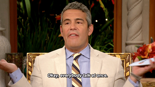 In comparison, the Real Housewives shows are the most female shows in that all that they are is talking. These shows are pure conversation. Talking talking talking, yelling, and then more talking, maybe some crying about the talking. And I have to tell you, recapping conversations isn’t easy — especially because so many of the conflicts that brew on these shows stem from how one woman perceived what another woman said. It’s never just about what was said but instead, more importantly how it was said, which can be hard to convey in a blog. Now, take all that yapping and feelings and misunderstandings but have all of it take place at once and you just made yourselves a Real Housewives reunion special. And every single one leaves me feeling like this: