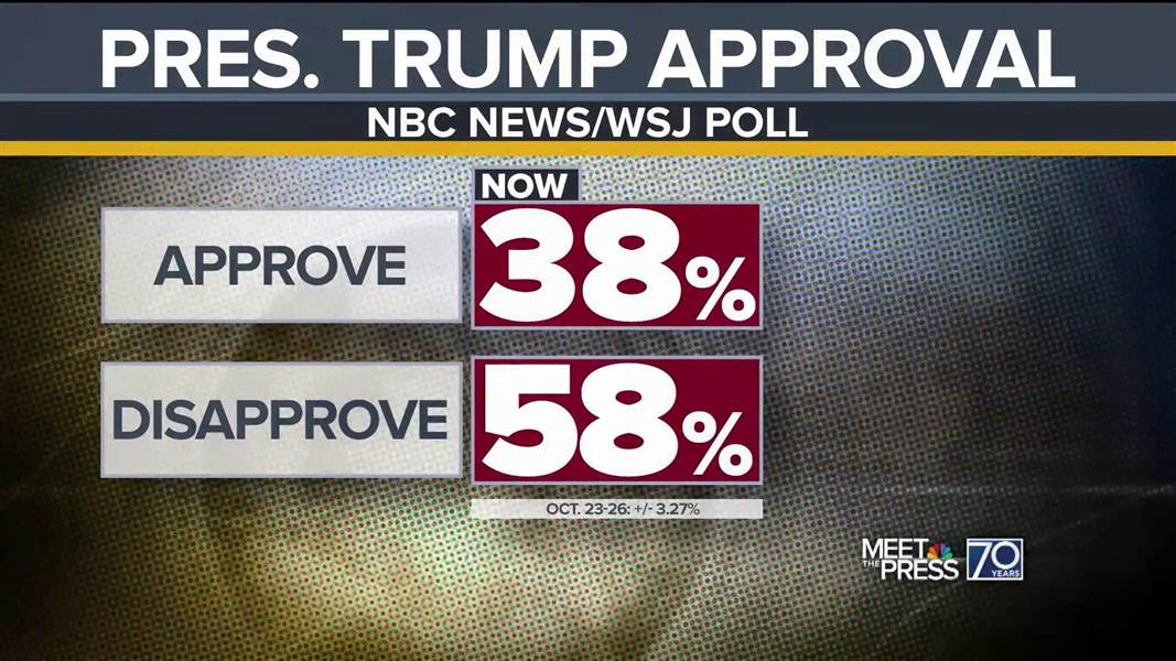 The NBC/WSJ poll was conducted Oct. 23-26 of 900 adults, including nearly half of whom were reached by cell phone, and it has an overall margin of error of plus-minus 3.3 percentage points. The margin of error for the 753 registered voters interviewed in the poll is plus-minus 3.6 percentage points.
